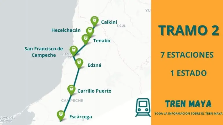 Este Tramo 2 del Tren Maya da comienzo en la estación de Escárcega, y tras atravesar casi 230 kilómetros llega hasta la estación de Calkiní.